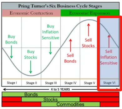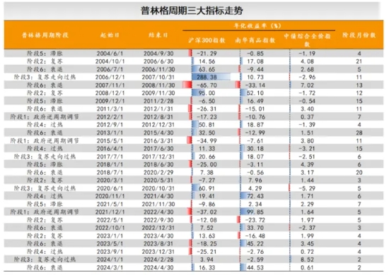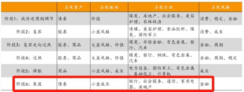 天风策略出了一篇普林格周期(叠加宏观调控因素的改良版美林时钟理论)在中国应用的研报,并且给出了普林格六阶段对应的国内强势大类资产、股票风格、股票板块名单。根据天风证券的观点,当下我们显然处于衰退期,所以建议重配债券;而如果一定要买股票,可以考虑小盘成长风格,具体板块包括银行、地产、社服、家电、通信。天风证券的结论肯定是有问题的,毕竟银行、地产和小盘成长风格怎么看也凑不到一起。具体分析我们放到最后...
