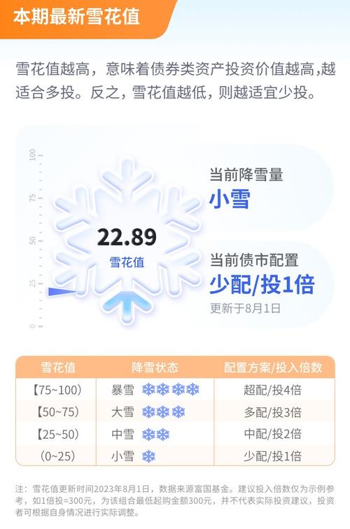 大家好!我是哈哈姐,每天我会与大家分享一些我对市场的看法以及投资思考,陪伴大家一起慢慢变富~“雪花值发车”是富国星投顾提供的一种定期不定额,智能定投的组合跟投服务,以“雪花值”为核心指标,雪越大,代表当前债市潜力越大,可以多投。“雪花值发车”于每周二更新,手把手带你解决稳健型投资怎么投、投多少的难题。01本周最新雪花值截至2023年8月1日,本周最新雪花值为22.89,小雪(区间为0~25),较...