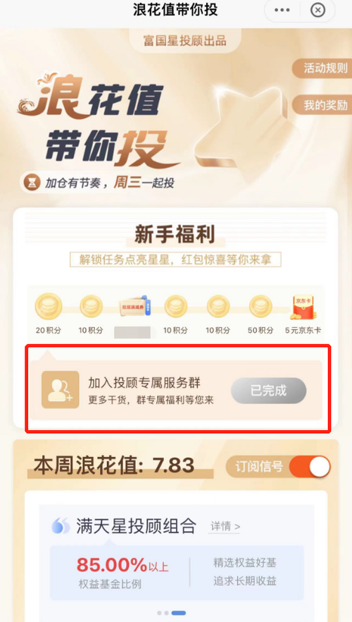 大家好!我是哈哈姐,每天我会与大家分享一些我对市场的看法以及投资思考,陪伴大家一起慢慢变富~大家好,我是哈哈姐,也是“浪花值发车日”的领航员,每周三我会与大家分享一些我对市场的看法及投资思考,陪伴大家一起慢慢变富。01本周发车信息浪花值发车是由富国星投顾提供的一种定期不定额,智能定投的策略跟投服务,以“浪花值”为核心指标,旨在帮助投资者在长期维度中,更科学、更轻松地投资权益类资产。本周发车信息如...