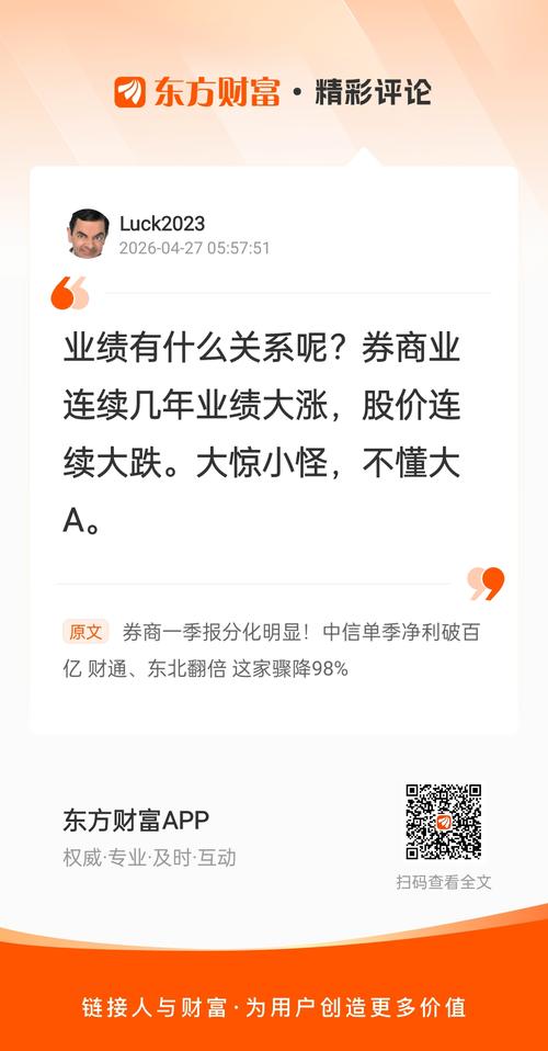 业绩有什么关系呢?券商业连续几年业绩大涨,股价连续大跌。大惊小怪,不懂大A。 我在《券商一季报分化明显!中信单季净利破百亿财通、东北翻倍这家骤降98%》的评论获得了大家的关注。