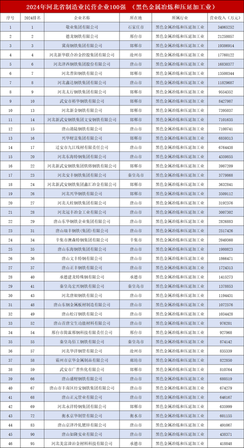2024年8月27日,2024河北省民营企业百强发布会在承德举行。河北省工商业联合会发布了“2024河北省制造业民营企业100强”等榜单。一起来看看有哪些钢铁企业上榜!在“2024河北省制造业民营企业100强”榜单中,属于黑色金属冶炼和压延加工业的企业共有46家,其中,敬业集团有限公司以3406.53亿元营收位列河北民企100强的第一位,德龙钢铁、冀南钢铁分别位列二、...