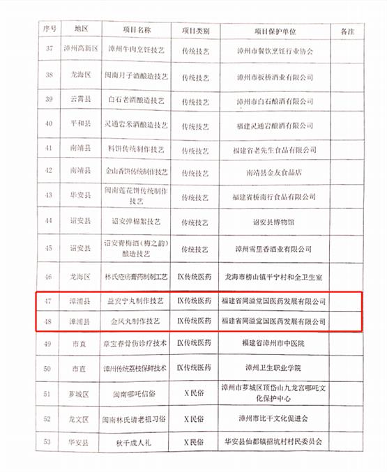 2023年1月12日,漳州市政府发布了《第九批市级非物质文化遗产代表性项目名录的通知》,确定了第九批市级非物质文化遗产代表性项目名录59项,其中新增项目53项,扩展项目名录6项。同溢堂益安宁丸和金凤丸制作技艺作为传统医药项目类别入选47/48新增项目。益安宁丸制作技艺益安宁丸制作技艺以何氏家族口传心授方式传承,遵古炮制、依方制剂。其药方主要由西洋参、石斛、冬虫夏...