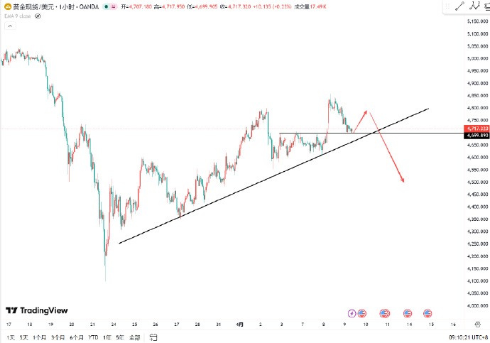 #黄金#周三高开后多头没有延续,美盘跳水,那就说明战争和解这个事情还有反复,不然资金不会那么担心。从黄金走势上看,美盘跳水说明不强,短线支撑4700,今天可以先做一个反弹。但前高点可能不会破了。