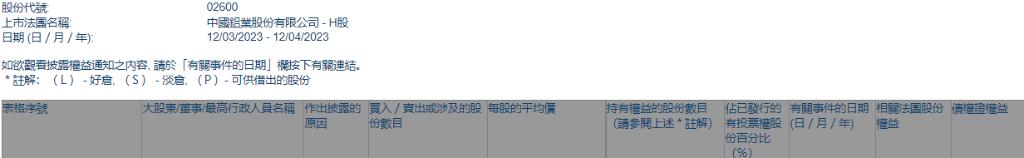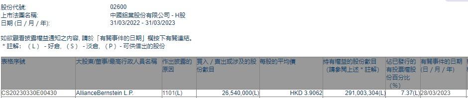 AllianceBernstein L.P.增持中国铝业(02600)704万股 每股作价约3.93港元