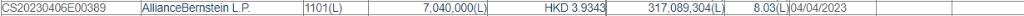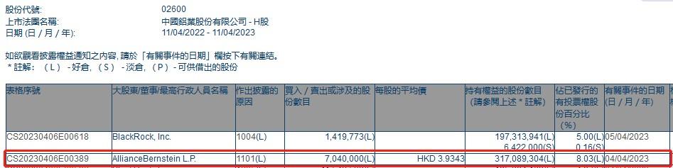 格隆汇4月12日丨根据联交所最新权益披露资料显示,2023年4月4日,中国铝业(02600.HK)获AllianceBernsteinL.P.在场内以每股均价3.9343港元增持704万股,涉资约2769.75万港元。增持后,AllianceBernsteinL.P.最新持股数目为317,089,304股,持股比例由7.86%上升至8.03%。