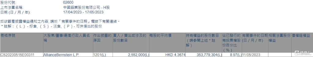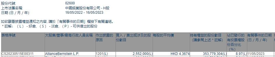 AllianceBernstein L.P.减持中国铝业(02600)255.2万股 每股作价约4.37港元