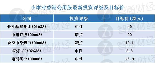 小摩:香港公用股最新投资评价及目标价(表) 较看好中电控股(00002)