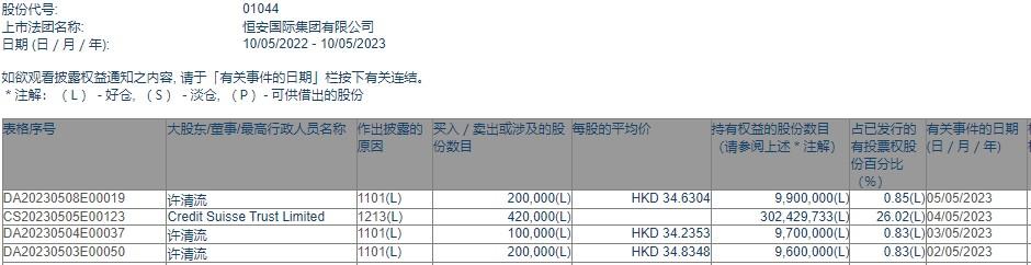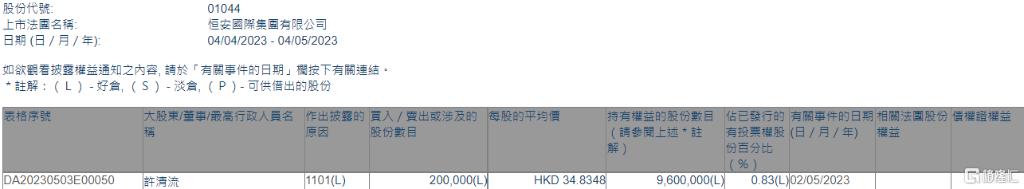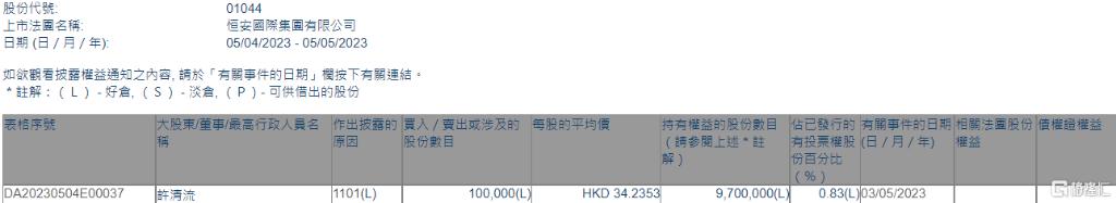 格隆汇5月5日丨根据联交所最新权益披露资料显示,2023年5月3日,恒安国际(01044.HK)获执行董事许清流在场内以每股均价34.2353港元增持10万股,涉资约342.353万港元。增持后,许清流最新持股数目为970万股,持股比例为0.83%。