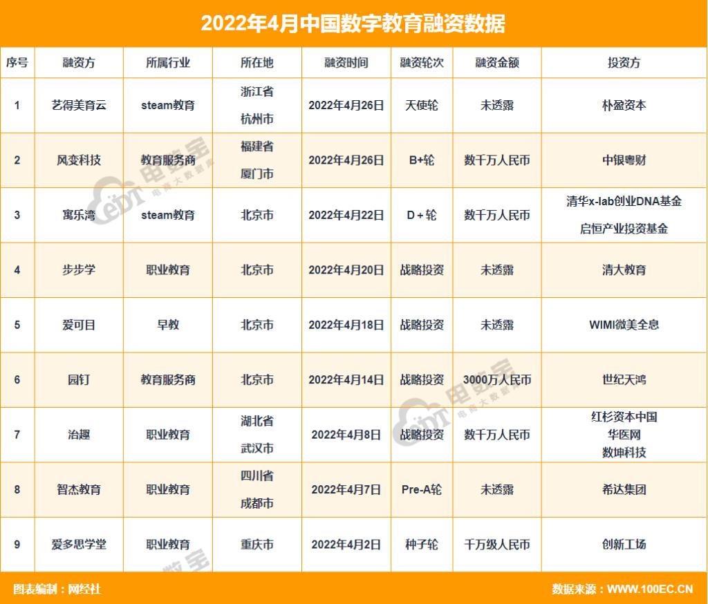 导读:2022年4月份,在线教育领域又发生了哪些事情?融资方面,本月融资9起,总融资金额超1亿元。行业动态方面,网课严选平台“网课超市”上线,知乎正式登陆港交所,掌门教育、瑞思教育、流利说面临退市,思维造物、宝宝巴士上市进程暂停,51Talk联合创始人兼COO张礼明辞职。以下为网经社教育台(EDU..CN)带来在线教育领域4月最新动态回顾。一、融资事件据网经社旗下电商大数据库“电数宝”(D...