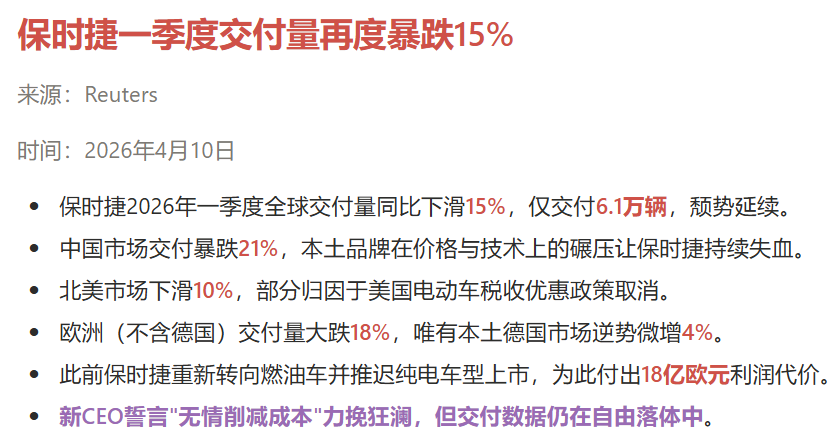 资讯 保时捷一季度全球销量下滑15% 在华跌两成至7519辆