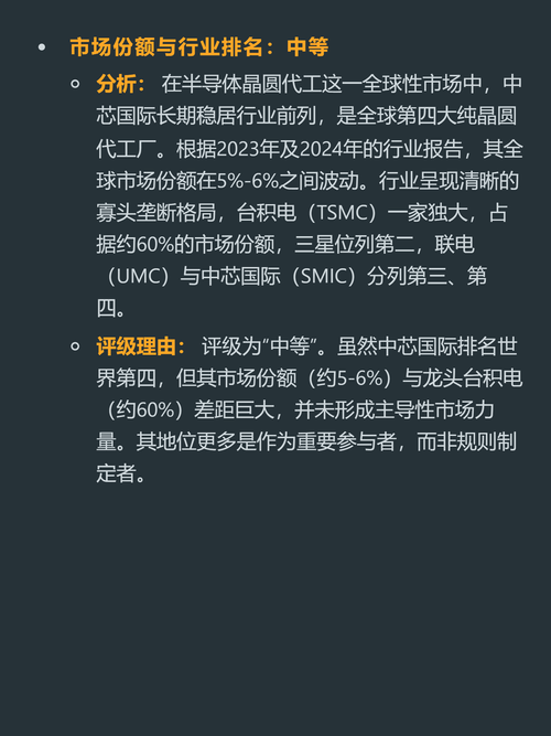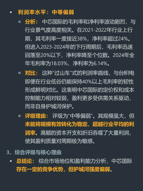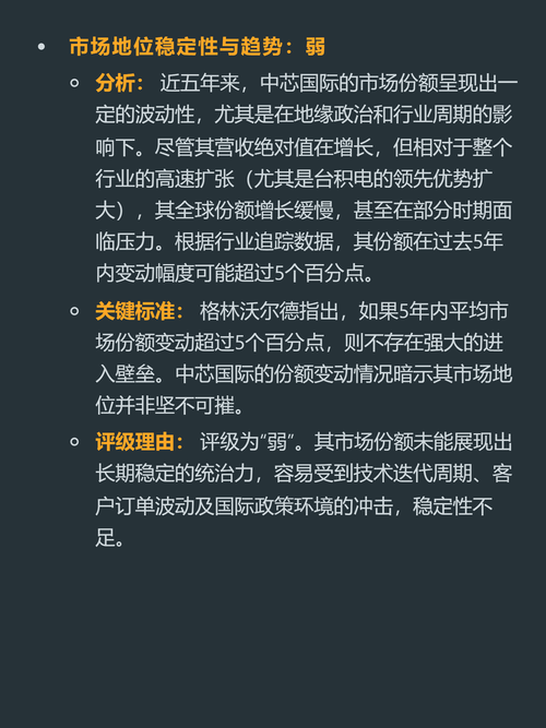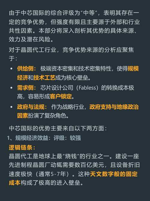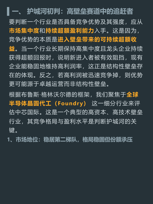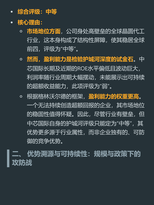 $中芯国际(HK|00981)$$台积电(NYSE|TSM)$$三星电子(GDR)(OTCBB|SSNGY)$很多人把中芯国际当成国产半导体的“全村希望”,但用经典价值投资框架测算,它的护城河强度其实只能打到中等。 晶圆代工是全球出了名的高壁垒赛道,建厂动辄要数百亿投入,新玩家基本没可能入场。中芯目前是全球第四大纯代工厂,手握5%左右的全球份额,还有大基金的资金支持和国产替代的需求托底,基本盘稳,...
