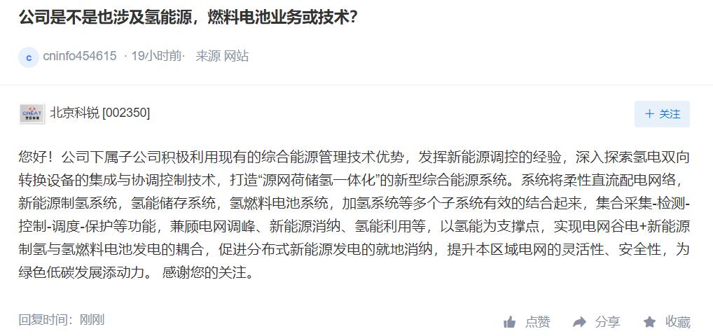 「上市公司」是氢云链旗下的全新栏目,主要包含投资者在互动平台上针对氢能、燃料电池等内容方面进行提问和相关企业的回复,每天一期。在这里,你可以全面了解企业的氢能发展动态。北京科锐问:公司是不是也涉及氢能源,燃料电池业务或技术?北京科锐答:您好!公司下属子公司积极利用现有的综合能源管理技术优势,发挥新能源调控的经验,深入探索氢电双向转换设备的集成与协调控制技术,打造“源网荷储氢一体化”的新型综合...