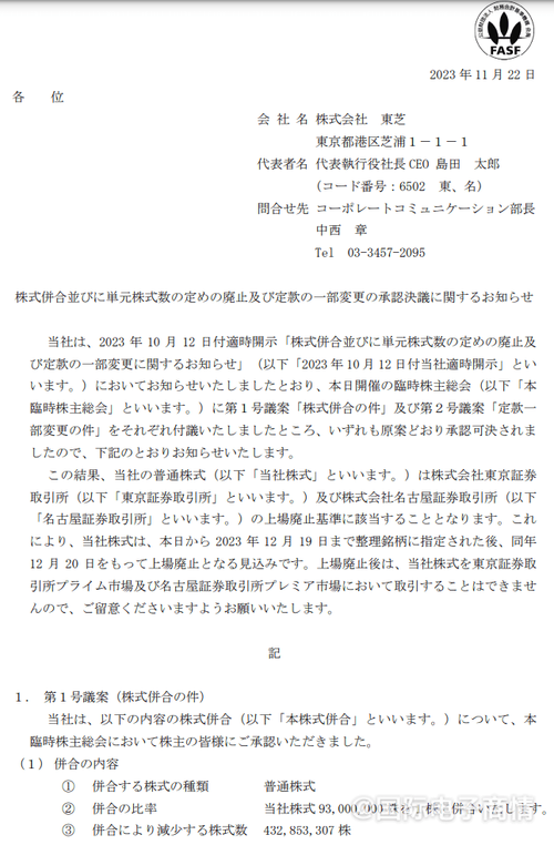 $东芝(ADR)(OTCBB|TOSYY)$官网公告,在周三的临时股东大会上,东芝公司正式通过公司私有化提案,宣布将于12月20日从东京证券交易所下市。据悉,2023年8月,以日本国内基金JapanIndustrialPartnersInc.(JIP)为主的财团,正式开始向东芝发起总额约2万亿日元(153亿美元)的收购邀约。而该财团预计将从普通股东收购剩余股份,将东芝收购为全资子公司。9月,东...