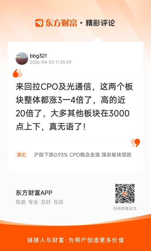 来回拉CPO及光通信,这两个板块整体都涨3一4倍了,高的近20倍了,大多其他板块在3000点上下,真无语了! 我在《沪指下跌0.93%CPO概念走强煤炭板块领跌》的评论获得了大家的关注。