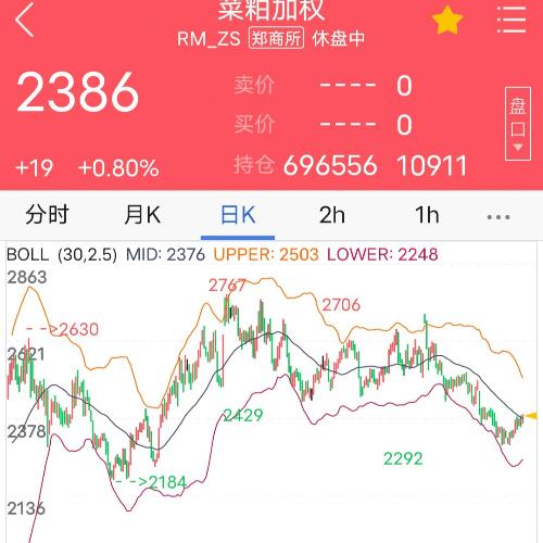 $菜粕601(CZCE|RM601)$行情走势跟踪—— 指数价格跟踪——见阳见涨,见阴见跌 价格在boll中轨阴阳线上方,多头趋势中 你不用担心; 也不需要怀疑; 多仓从容跑步进场! 日线周期级别处于多方力量主导趋势中。 1.20均价线为阴;阳分界线。 2.boll中轨为阴;阳分界线。 3.macd0轴为阴;阳分界轴。 追涨顺势但有缺, (缺)现在进场做多不是超卖最佳机会位 (缺)价格遇到上方压力...