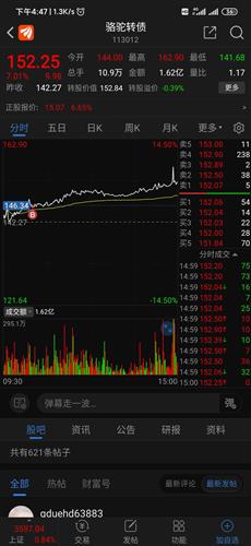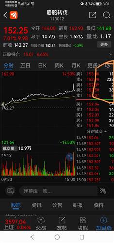 14:53:22至14:54;34的72秒时间,转债交易价突然从152.50拉高到153.XX,154.XX,155.XX,156.XX.157.XX最高到162.90,而后回落。彼时转股溢价率已翻+,转股值也低于成交价。卖方好理解,高价卖出胜于转股。买方呢?花如此高价买债转股,图个傻乐?粗略估算在153.00之上交易量超过3000手,这也绝非一般散户能力所及。乌龙指?一笔两笔也许误打,连续几十笔...