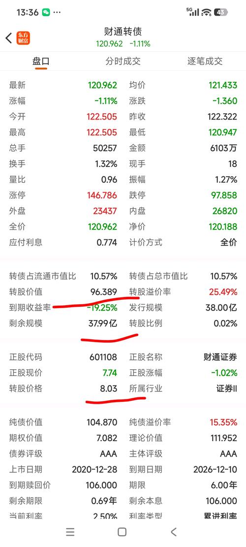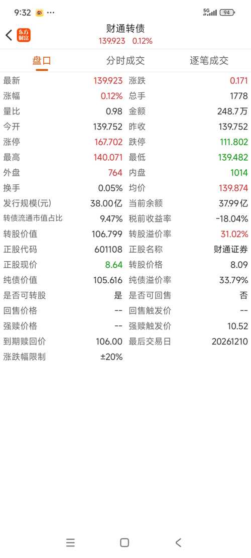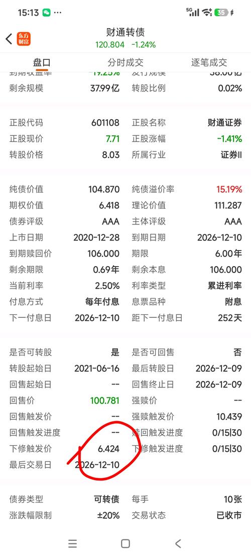 $财通转债(SH113043)$ 以下基于2026年1月23日收盘数据(财通转债113043,转股价8.03元/股,债现价146.056元/张,正股601108收盘价11.01元/股)计算,含转股操作、成本与亏损,数据截至当日收盘。 一、转股操作 -转股期限:2021-06-16至2026-12-09,当前处于可转股期。 -操作入口:券商APP“转股回售”,输入转债代码113043、转股数量,交易...