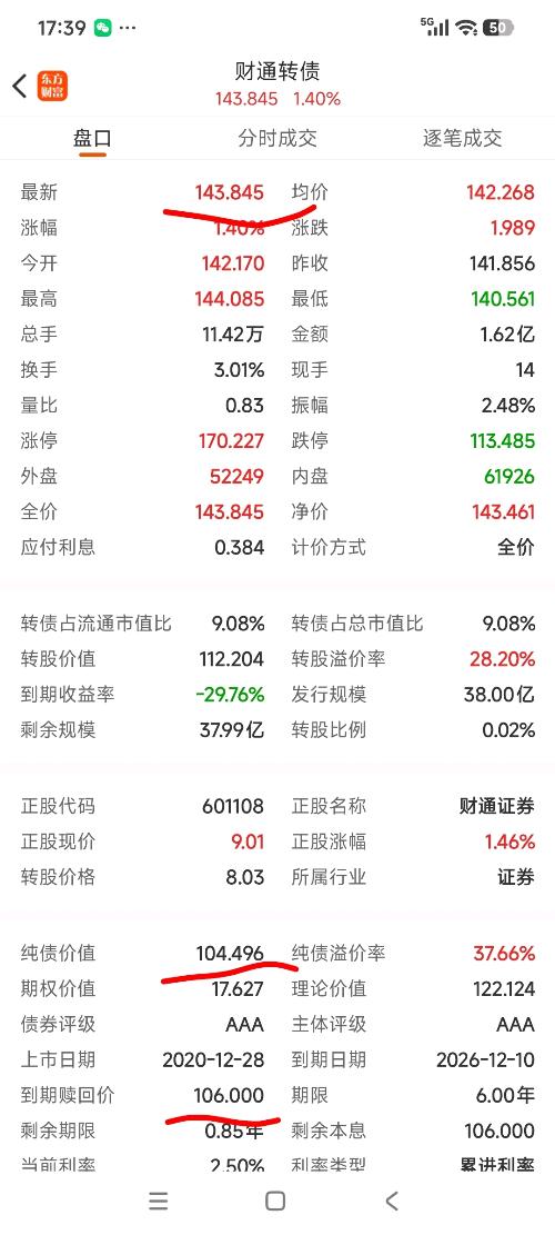 $财通转债(SH113043)$财通转债纯价值:106元!转债价钱:143.85-106=37.85持有债券明显亏损37.85元!拉升财通转债目的是什么???