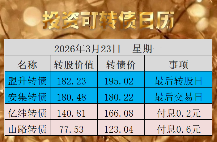 原文发送于昨日晚间自媒体。 《大肉签统联转债上市》中,预测统联转债上市首日收盘溢价率约为78%。实际收盘溢价率为85%,小超预期。中1签的投资者盈利约320元。有幸中签的网友卖出后,欢迎留言说一下赚了多少! 23日为盟升转债最后转股日,如果投资者忘记转股操作,将被100.32元赎回,亏损40%以上。 23日为安集转债最后交易日,如果投资者忘记操作,还可以在26日最后转股日之前转股卖出。 24日亿纬...