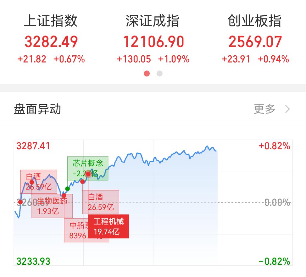 大家好,今天A股三大指数集体上涨,深成指涨逾1%。盘中军工、工程机械、酿酒板块涨幅居前,家居、建材、食品饮料、钢铁、汽车、医药、券商等板块均走强,仅银行、煤炭等板块小幅走低。截至发文,个股方面涨多跌少,两市涨停个股41家,跌停2家,市场赚钱效应尚可。截至发文,上证指数上涨0.67%,报于3282点;深证成指上涨1.09%,报于12106点;创业板指上涨0.94%,报于2569点。盘面上...