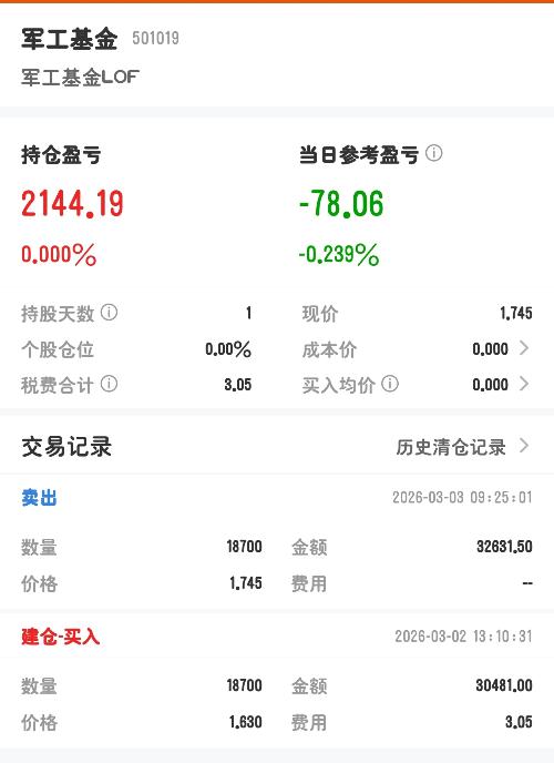 $军工基金LOF(SH501019)$昨天买,今天卖。最快的交易,很看好军工。换一个没有溢价的
