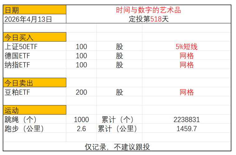 运动与投资第518天 2026年4月13日 今日定投: 上证50ETF买入100股 德国ETF买入100股 纳指ETF买入100股 豆粕ETF卖出200股 跳绳:1000个,累计跳绳:2238831个 慢跑:2.60公里,累计慢跑:1459.70公里 $上证50ETF华夏(SH510050)$$上证50ETF易方达(SH510100)$$上证50(SH000016)$