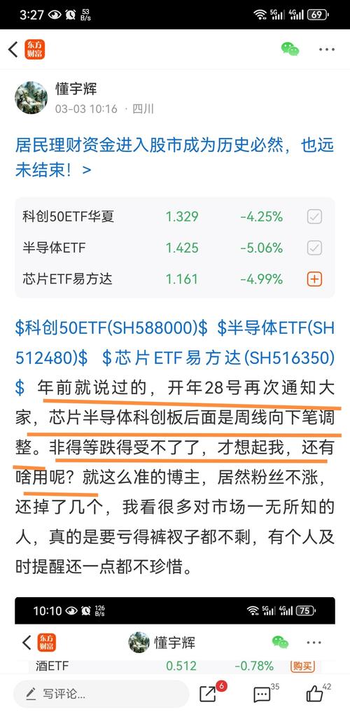 $酒ETF(SH512690)$$科创50ETF华夏(SH588000)$$半导体ETF(SH512480)$我的粉丝已经几千号人了。在年前一直就在说。日线形成二卖以后要形成周线级别下跌。今天都在加速下跌。中途也再说。特别是白酒。已经说过了,在那个地方震荡以后还是要新低的。关于银行,我一说,它是反弹不了多少的,今天银行也跟着暴跌,如果有人认为我是蒙的,怎么会蒙对这么多呢?我想问一下,我这几千号粉丝...