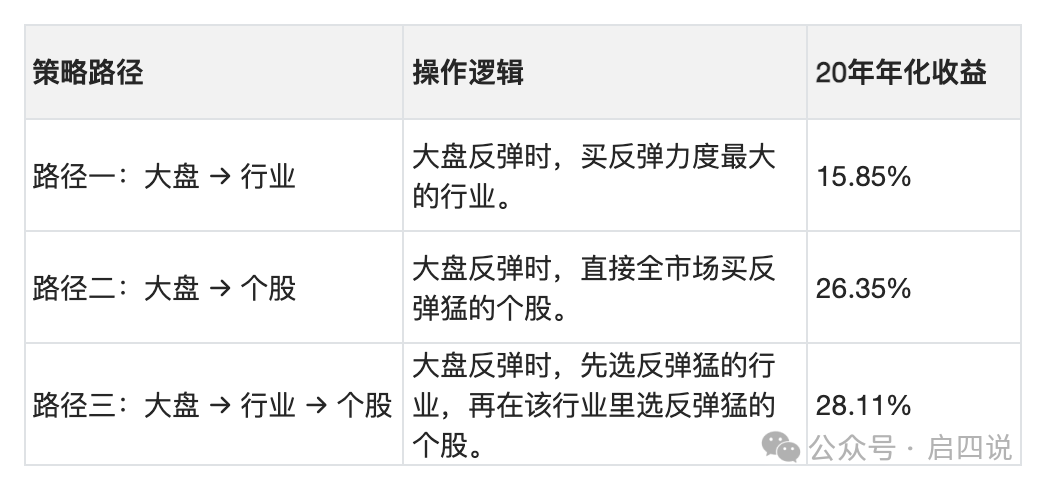 今日复盘 今天看到广发证券的一份研报《如何识别宏观触底与微观领涨》。 这份研报,核心就是在研究怎么用“量化模型”来抄底? 简单来说,研报里通过历史数据回测,发现了一套“自上而下”的选股逻辑:先看大盘见底反弹,再选最猛的行业,最后在行业里挑最强的个股。 1、核心结论 研报测试了三种路径,结果差异很大。路径越精细,收益越高。 先定行业,再定个股,这种“双重过滤”能筛出爆发力最强的票。 2、什么是“反弹...