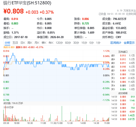 银行ETF华宝场内拉升0.37%,青岛银行领涨5.29%,债市利率回落带动非息收入增长缓解压力