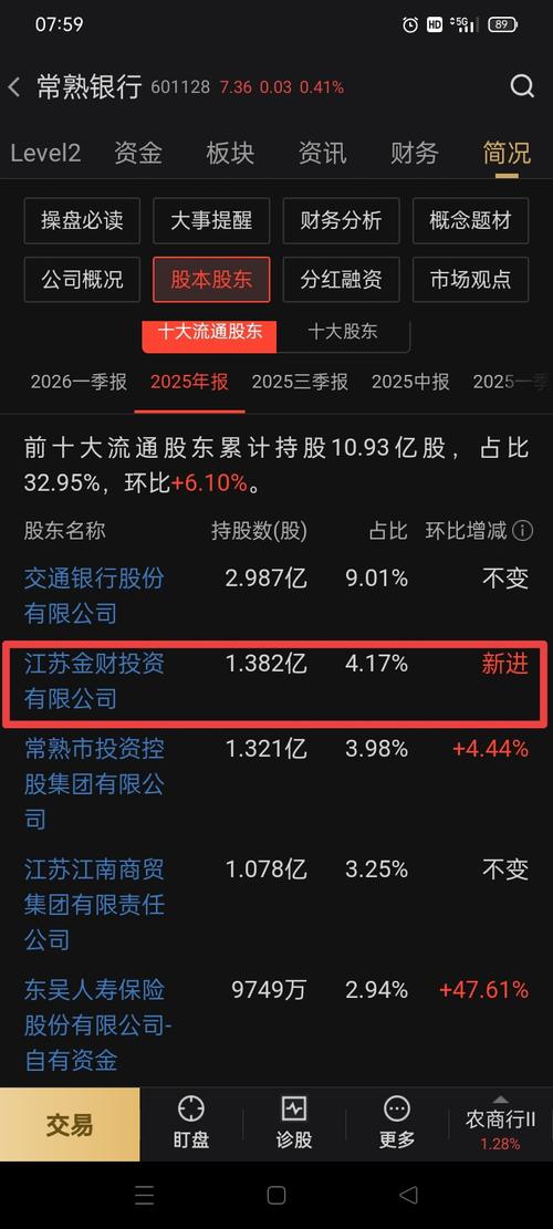 $常熟银行(SH601128)$ 0423快报:常熟银行亮丽的年报季报点评 据常熟银行年报季报公告: 一,省级国资江苏金财投资公司强力进驻战略投资成为第二大股东。 据年报公示,省级国资江苏金财投资公司于2025年四季度强力跑步进驻,进行战略性投资,猛买1.38亿股,一下子成为第二大股东!常熟银行四季度的平均价格大概是7.10元。 二,常熟市GPD强劲增长的势头,是常熟银行利润连续快速增长的基础 常...