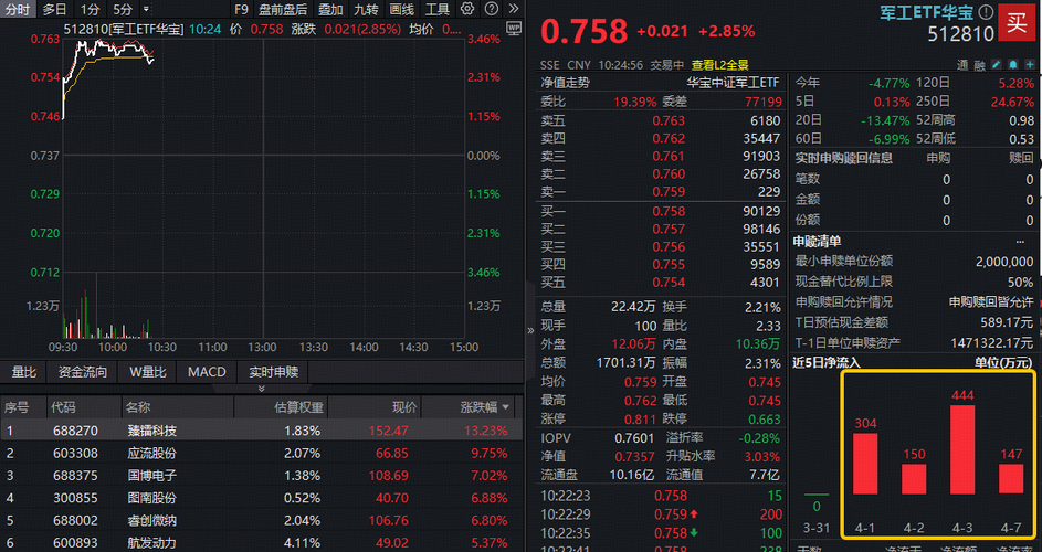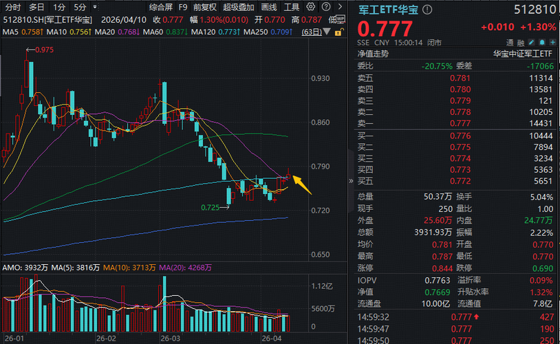 $航发动力(SH600893)$ 4月10日,A股再度反弹,军工板块随市回暖,军工核心资产——军工ETF华宝(512810)高开后一度上探2.6%,收涨1.3%收复20日线及半年线,日线斩获四连阳!全天成交3932万元。 军工ETF华宝(512810)成份股66涨1平13跌。中国动力斩获南美大单,跳空高开、一字涨停,股价创10年新高!权重龙头航发动力大涨3.88%。睿创微纳涨4.47%,应流股份、...