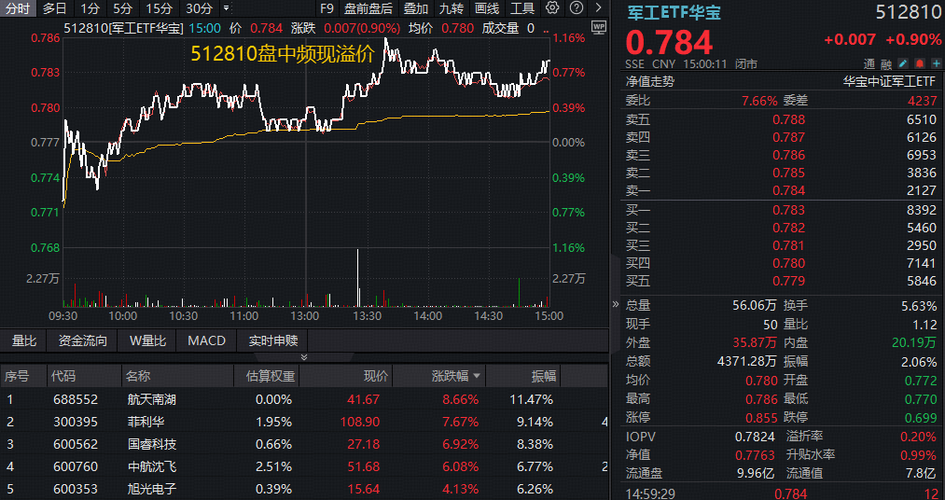 $航天南湖(SH688552)$ 4月13日,A股顽强收涨,军工板块强于大市。军工核心资产——军工ETF华宝(512810)收涨0.9%日线斩获五连阳!全天放量成交4371万元。午后场内频现溢价,收盘溢价率仍有0.2%,显示买盘资金较为活跃。 军工ETF华宝(512810)成份股58涨22跌,商业航天概念股领涨,航天南湖午后一度飙升逾10%,收涨8.66%,菲利华张7.67%。中航系集体拉涨,中航...