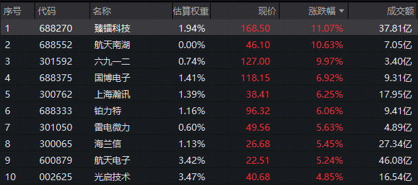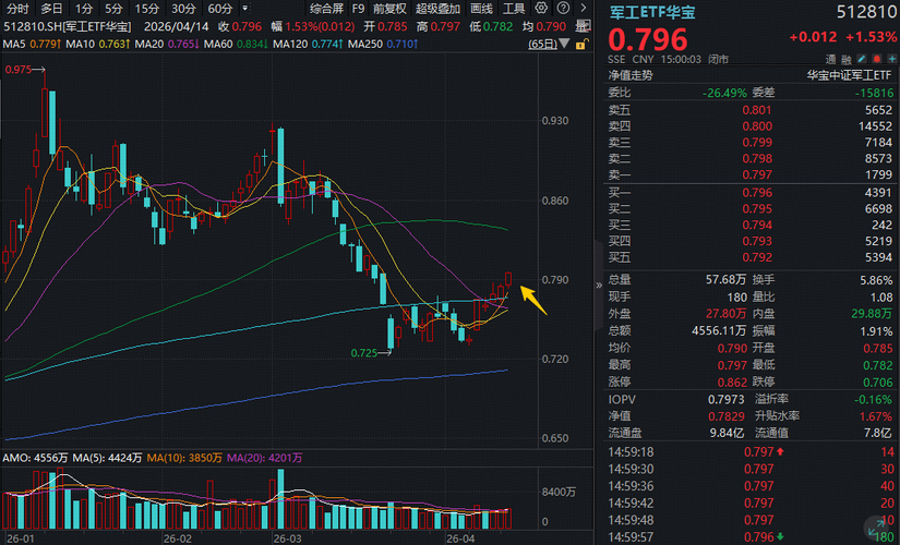 $六九一二(SZ301592)$ 4月14日,A股午后发力,沪指一举重返4000点。军工板块继续向上,军工核心资产——军工ETF华宝(512810)收涨1.53%,日线豪取六连阳!全天成交4556万元,连续两日放量。 军工ETF华宝(512810)成份股67涨13跌,商业航天概念股继续领涨,臻镭科技暴涨11.7%居首,航天南湖强劲续涨10.63%,航天电子大涨5.24%。军工信息化同步走强,六九一...