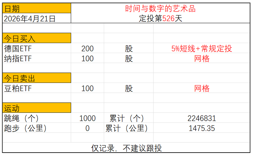运动与投资第526天 2026年4月21日 今日定投: 德国ETF买入200股 纳指ETF买入100股 豆粕ETF卖出100股 跳绳:1000个,累计跳绳:2246831个 慢跑:0公里,累计慢跑:1475.35公里 $德国DAX30(QQZS|GDAXI)$$德国ETF嘉实(SZ159561)$$德国ETF华安(SH513030)$