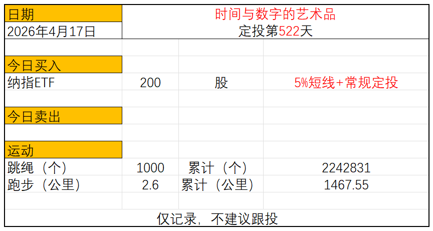 运动与投资第522天 2026年4月17日 今日定投: 纳指ETF买入200股 跳绳:1000个,累计跳绳:2242831个 慢跑:2.60公里,累计慢跑:1467.55公里 $纳指ETF国泰(SH513100)$$纳指ETF广发(SZ159941)$$纳斯达克100(QQZS|NDX100)$