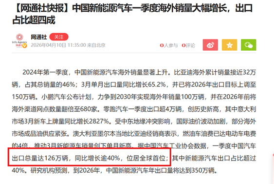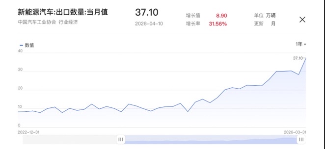 美伊冲突爆发后,油价不断创新高,导致新能源车相较于燃油车的性价比进一步提升,间接推升了中国新能源汽车出口景气度。 一季度中国新能源汽车海外销量全面爆发,比亚迪一季度海外销量40万辆,同比55.2%,吉利一季度海外销量20.3万辆,同比126%,奇瑞一季度海外销量39.3万辆,同比53.9%。一季度中国汽车出口总量为126万辆,同比40%,单看3月出口总量为37.1万辆,创历史新高。在国内销售低迷的...