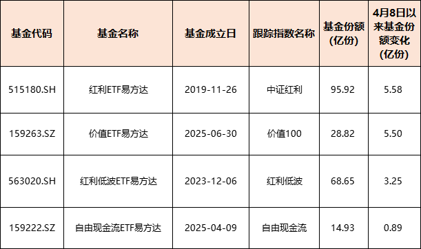 4月8日以来市场快速反弹,沪指重返4100点,创业板指更是一举打破2015年高点创出历史新高,不过看场内ETF份额变化数据的时候,我发现有挺多资金在向红利ETF易方达(515180)、价值ETF易方达(159263)、红利低波ETF易方达(563020)、自由现金流ETF易方达(159222)等“红利+”策略的产品上集聚。数据来源:Choice,截至4月22日截至4月22日,红利ETF易方达、价值...