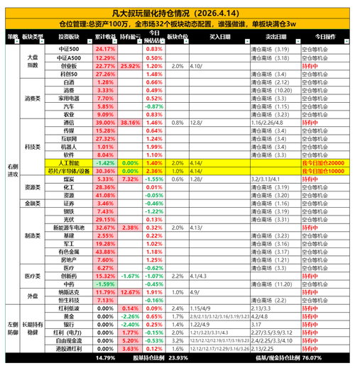 凡叔历史业绩(2008-2025): 每日预估收益(截止发文): 站上26日线,行情回暖!今天讲个我亲身经历的故事:那个让我翻倍的大哥,最后让我深套数年! 上证指数今日上涨0.22%,行情站上了26日均线,这是一个不错的好现象,市场开始逐步回暖了。大叔的操作也慢慢调整成进攻状态,但是一定要注意仓位管理。 我就说过:市场走强我必然在,市场走弱我跑得比谁都快。 先简单说一下手里几个持仓的情况。 通信依...