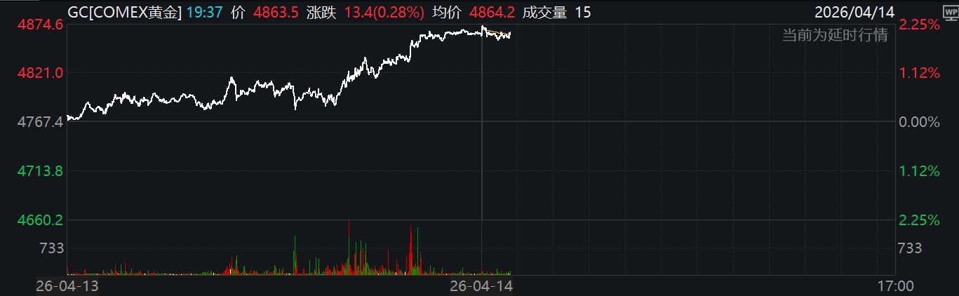 4月14日,受美伊和平谈判延续利好,布伦特油价大幅跳水,跌至95美元/桶,较周一高位大幅回撤8.2%,金价震荡攀升,COMEX黄金期货价格一举突破4800美元整数关口,国际金价在混乱之中已经从3月23日低点反弹超16%,黄金行情能否延续走强?#特朗普称美国对伊朗的战争已经结束##黄金投资讨论区#$西部黄金(SH601069)$$湖南黄金(SZ002155)$...