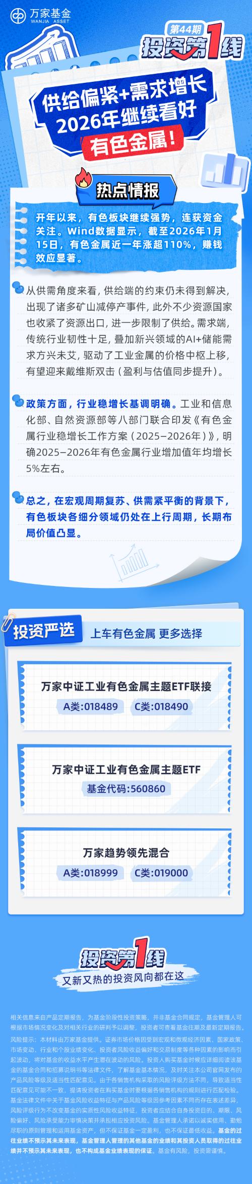 热点情报开年以来,有色板块继续强势,连获资金关注。Wind数据显示,截至2026年1月15日,有色金属近一年涨超110%,赚钱效应显著。$万家中证工业有色金属主题ETF发起式联接A(OTCFUND|018489)$$万家中证工业有色金属主题ETF发起式联接C(OTCFUND|018490)$$万家趋势领先混合A(OTCFUND|018999)$$万家趋势领先混合C(OTCFUND|019000)$...