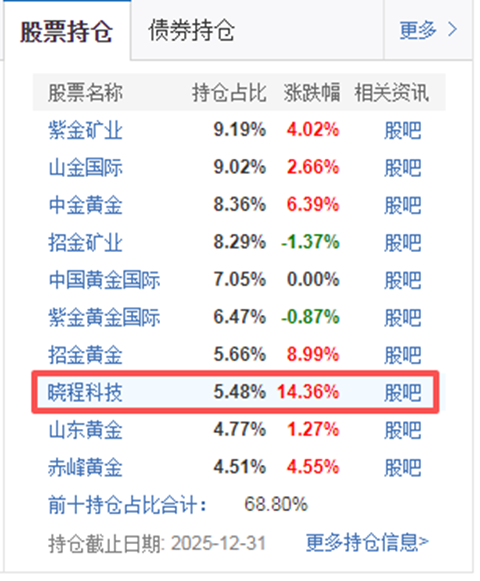 万家周期视野股票发起式C(025446),这只基金成立于2025年9月18日,至今133天,累计收益率56.08%。请看上图来自天天基金网的数据,除了近三个的业绩排名第2,其他排名,全是第一。用惊艳,或炸裂之类的词,都不足以形容它的业绩了。这是一只强到没有朋友的主动基金!作为一只主动基金,让我们来看一下他的前10重仓,九只股票都带了金字,只有晓程科技,显得有点另类。它已经从一家电力线载波芯片公司...