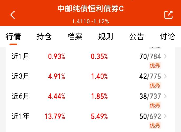 混债还拿了些扛打能力强的$中邮纯债恒利债券C$,投可转债+纯债,混债中波动比较小,管理费还是最低档的