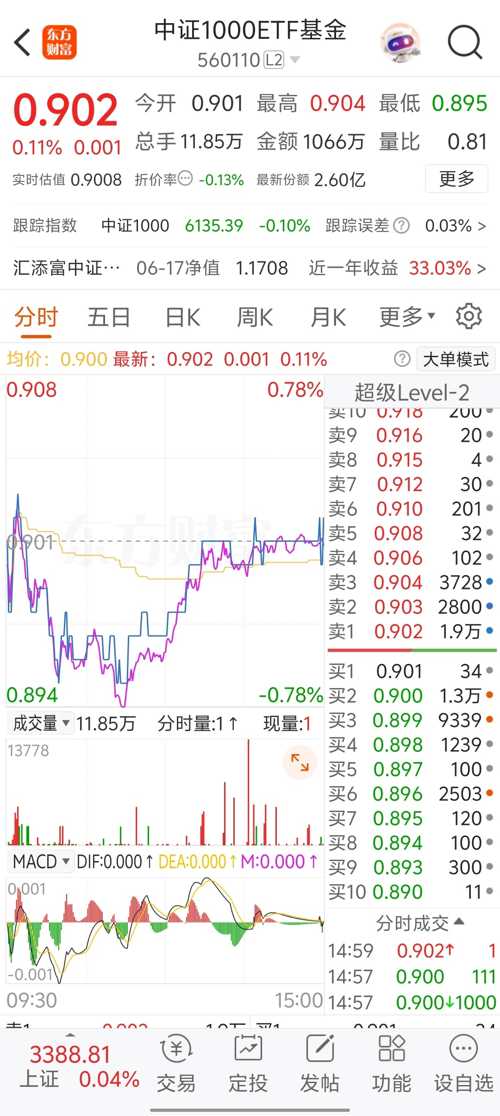 $中证1000ETF基金(SH560110)$ 哈哈,靠我的100股一手之力,生生把指数拉红了