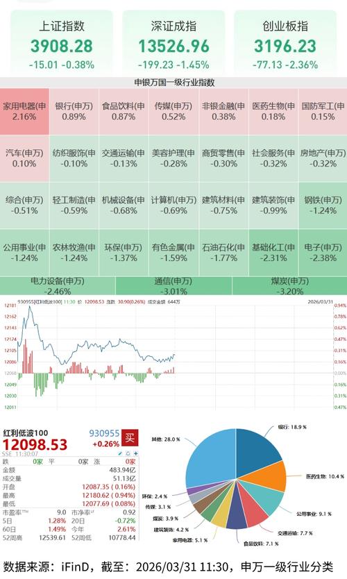 【午盘点评】今天上午A股三大指数集体下跌,截至午间收盘,上证指数跌0.38%、深证成指跌1.45%、创业板指跌2.36%。市场成交额13397亿元,较前一交易日放量108亿元,市场超3600只个股下跌。 板块题材上,家用电器(+2.16%)、银行(+0.89%)、食品饮料(+0.87%)等行业涨幅居前,煤炭、通信、电力设备等行业相对落后。 自2026年3月31日起,某53%vol500ml白酒(2...