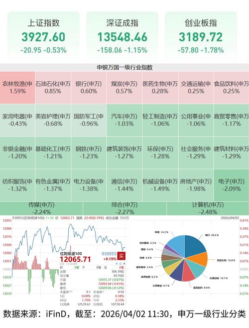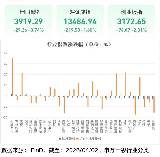 【午盘点评】今天上午A股三大指数集体下跌,截至午间收盘,上证指数跌0.53%、深证成指跌1.15%、创业板指跌1.78%。市场成交额11968亿元,较前一交易日缩量1389亿元,全市场超4200只个股下跌。 板块题材上,31个申万一级行业指数中仅农林牧渔、石油石化、银行、煤炭等7个行业上涨。成长风格受到压制,计算机、综合、传媒、电子等行业相对落后。 当地时间4月1日晚,特朗普发表讲话,自行宣称对伊...