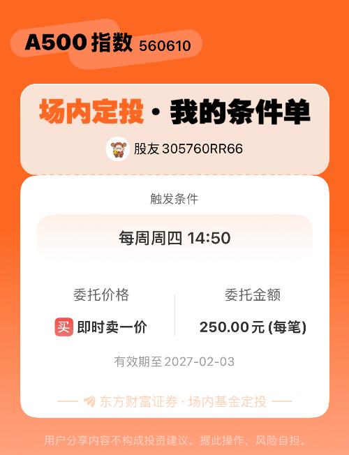 #条件单交流##场内定投晒单#一位股神设置了一个场内基金定投条件单,接下来就是见证奇迹的时刻~$A500指数(SH560610)$