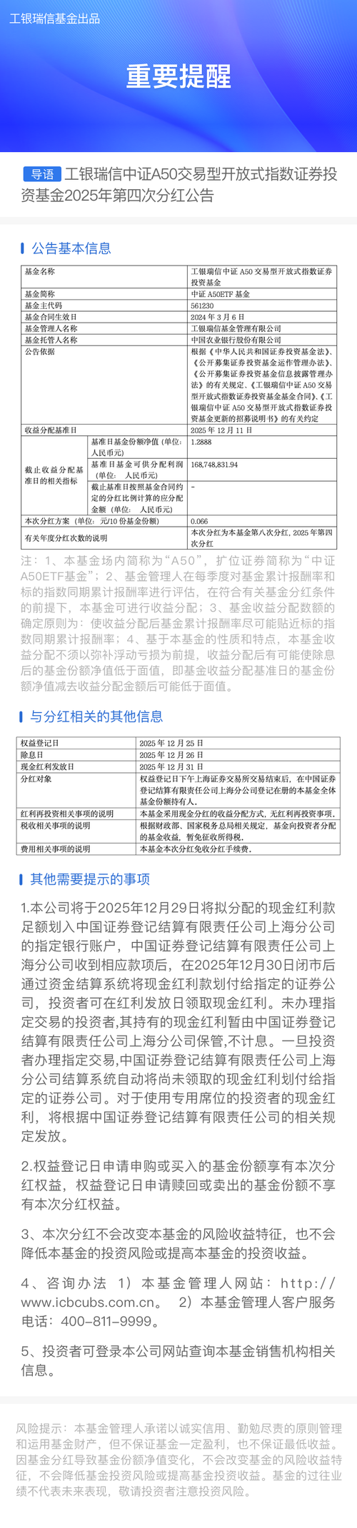 公告 工银瑞信中证A50交易型开放式指数证券投资基金2025年第四次分红公告