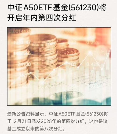 来源:ETF严选 最新公告资料显示,中证A50ETF基金(561230)将于12月31日派发2025年的第四次分红,这也是该基金成立以来的第八次分红。本次分红权益登记日为2025年12月25日,分红方案为0.066元/10份基金份额,基准日基金可供分配利润达1.68亿元。 Wind数据显示,中证A50ETF基金自2024年3月成立以来每个季度都分红,累计分红次数居首批中证A50ETF前列。中证A5...