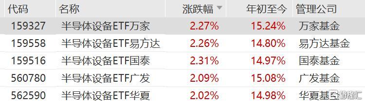 半导体设备领涨,半导体设备ETF万家、半导体设备ETF国泰、半导体设备ETF易方达、半导体设备ETF广发、半导体设备ETF华夏涨超2%。 半导体设备ETF跟踪中证半导体材料设备主题指数,聚焦产业链上游,半导体设备占比64.3%、半导体材料占比22.5%,成份股包括中微公司、北方华创、拓荆科技、长川科技、华海清科、沪硅产业、中科飞测、南大光电、安集科技、江丰电子等细分龙头企业。 消息面上,存储芯片开...