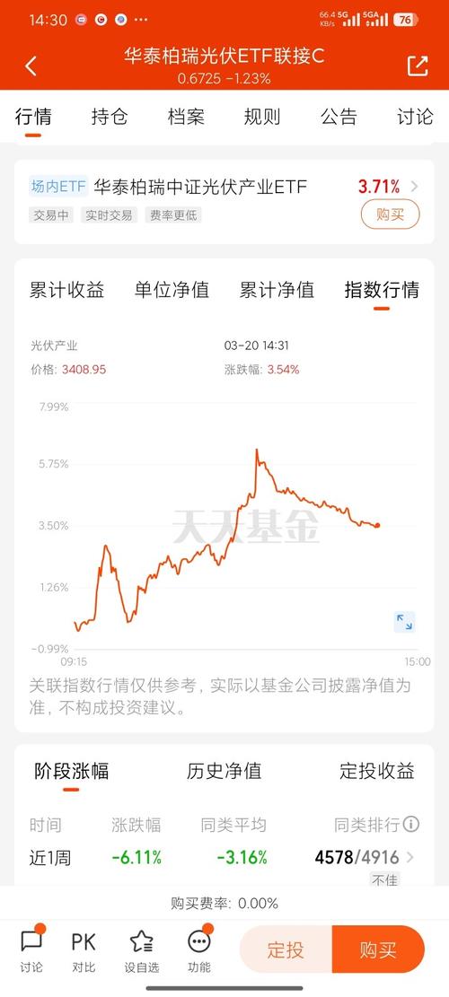 家人们,今天光伏板块直接杀疯了!指数蹭蹭往上冲,之前被磨得没脾气的朋友现在终于松了口气。投资这行最烦的就是天天盯着K线内耗,与其在波动里内卷到失眠,不如选个方向清晰的赛道长期拿着。现在光伏行业基本面是真在回暖,全球装机需求摆在那,之前压着行业的供应链问题也在慢慢缓解,估值也经过了长时间调整,性价比出来了。我一直盯着华泰柏瑞的光伏相关基金,它就是专门盯光伏产业指数的,不用你自己去挑哪家公司能活下来,...